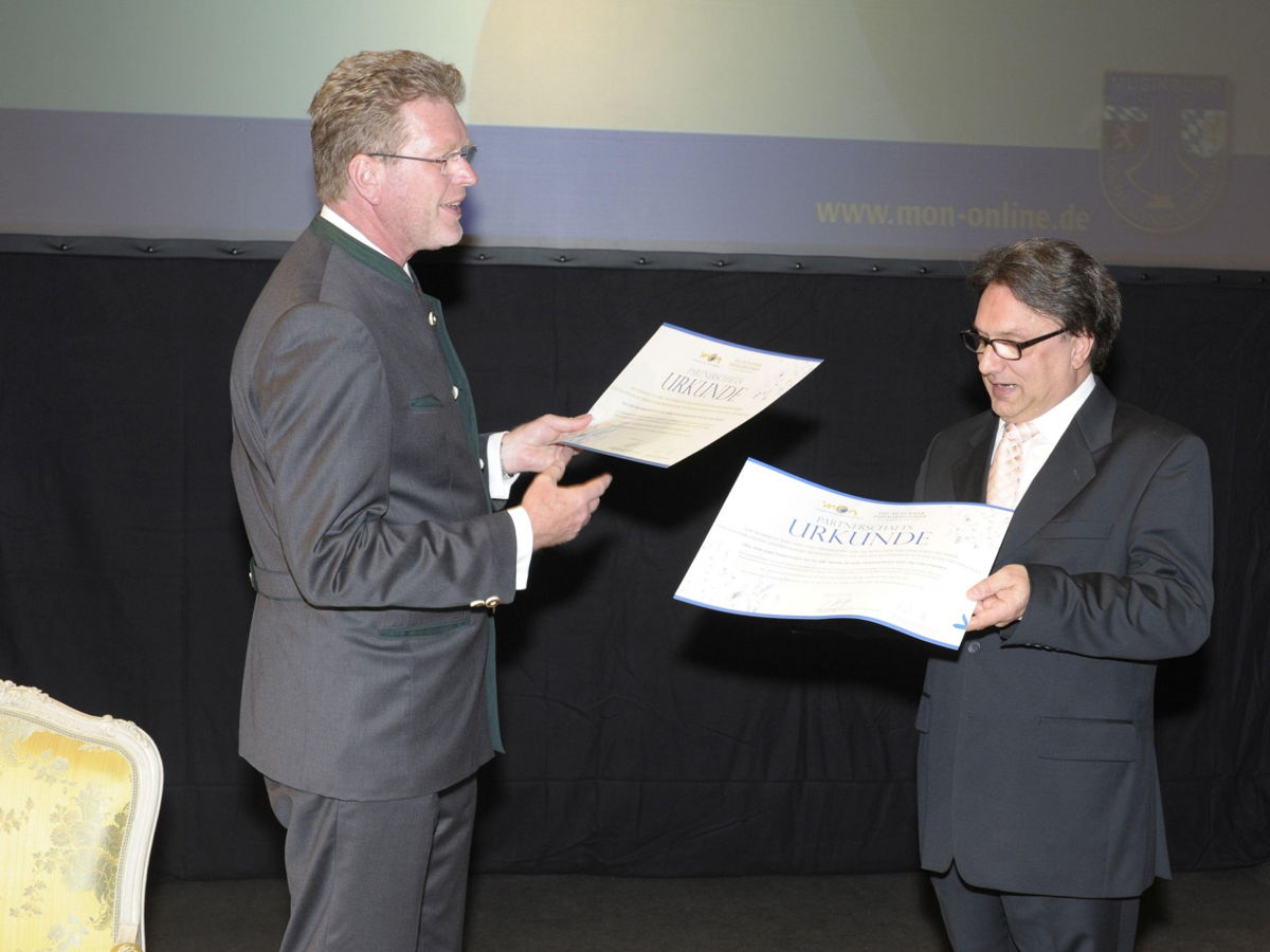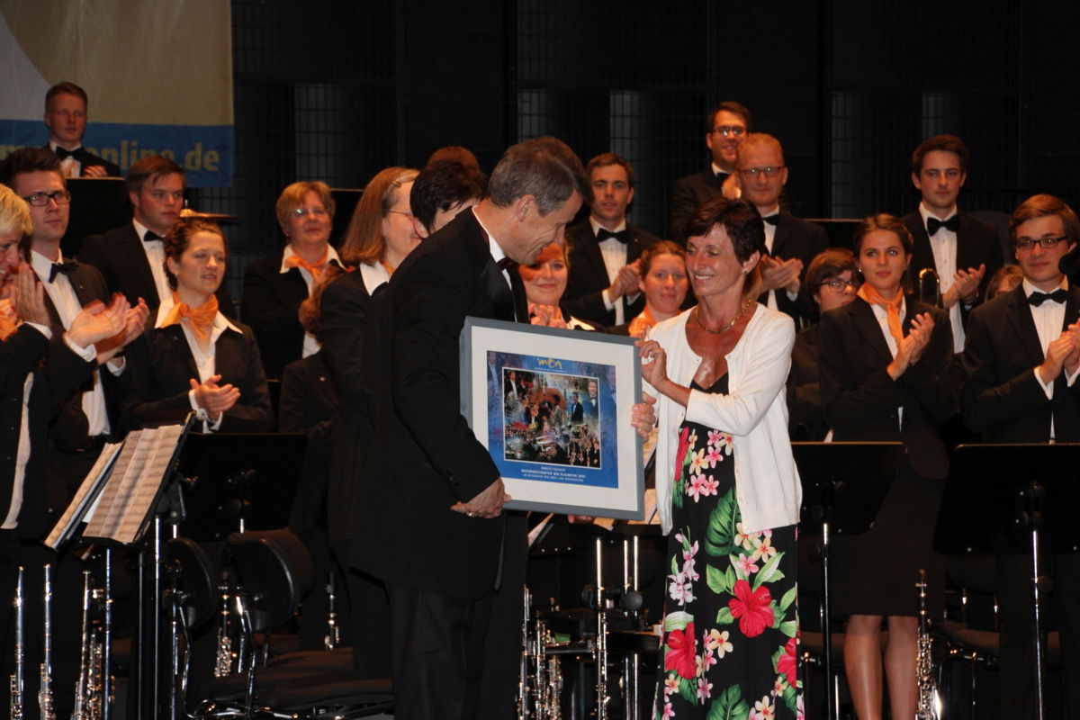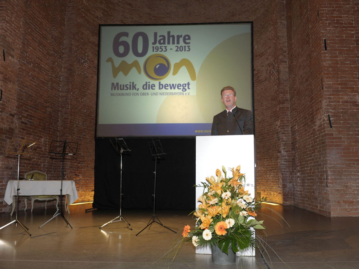 Die Begrüßung des MON-Präsidenten Dr. Marcel Huber beim Festakt fiel unerwartet nachdenklich und berührend aus. Noch unter dem Eindruck der unmittelbaren Erlebnisse schilderte er das Schicksal der Menschen im Hochwassergebiet, die er am Morgen besucht hatte, und den Zusammenhalt, der sie in Katastrophenzeiten stark mache. In diesem Zusammenhang sah Präsident Huber auch die Gründung des MON im Jahr 1953: "Das war ein Signal der Lebensfreude an der Blasmusik und durch die Blasmusik!" Zum Festakt mit anschließendem Staatsempfang kamen Weggefährten und Aktive im MON sowie zahlreiche Vertreter befreundeter Musikverbände und hochrangige Gäste aus der Politik. Es galt, Dr. Thomas Goppel zum Ehrenpräsidenten zu ernennen. Im Rahmen des Festakts unterzeichneten der MON-Präsident Dr. Marcel Huber und Guido Seegers, Solotrompeter der Münchner Philharmoniker/Spielfeld Klassik eine Urkunde, um die neue Partnerschaft zu besiegeln.