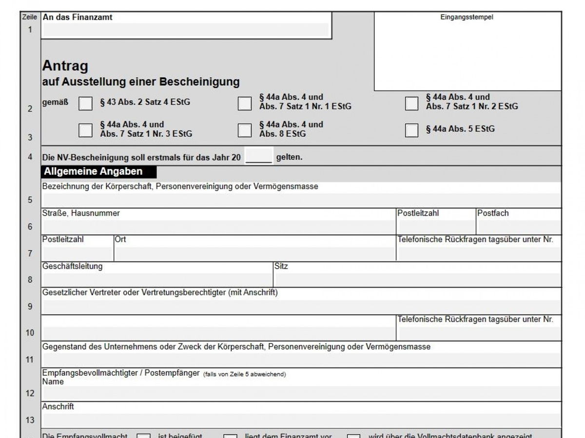 Der Verein kann dem Kreditinstitut eine NV-Bescheinigung vorlegen, die auf Antrag des Vereins vom Finanzamt ausgestellt wird. Erforderlich ist für gemeinnützige Vereine die NV-Bescheinigung „NV 2 B“. Der Antrag wird mit dem Vordruck „NV 2 A“ gestellt (PDF abrufbar unter https://www.finanzamt.bayern.de/Informationen/Formulare/Weitere_Themen_A_bis_Z/Nichtveranlagungsbescheinigungen/). Die Bescheinigung wird unter dem Vorbehalt des Widerrufs ausgestellt, ihre Geltungsdauer beträgt höchstens drei Jahre und endet am Schluss eines Kalenderjahres (z.B. ist eine im November 2021 ausgestellte Bescheinigung bis Ende 2023 gültig).